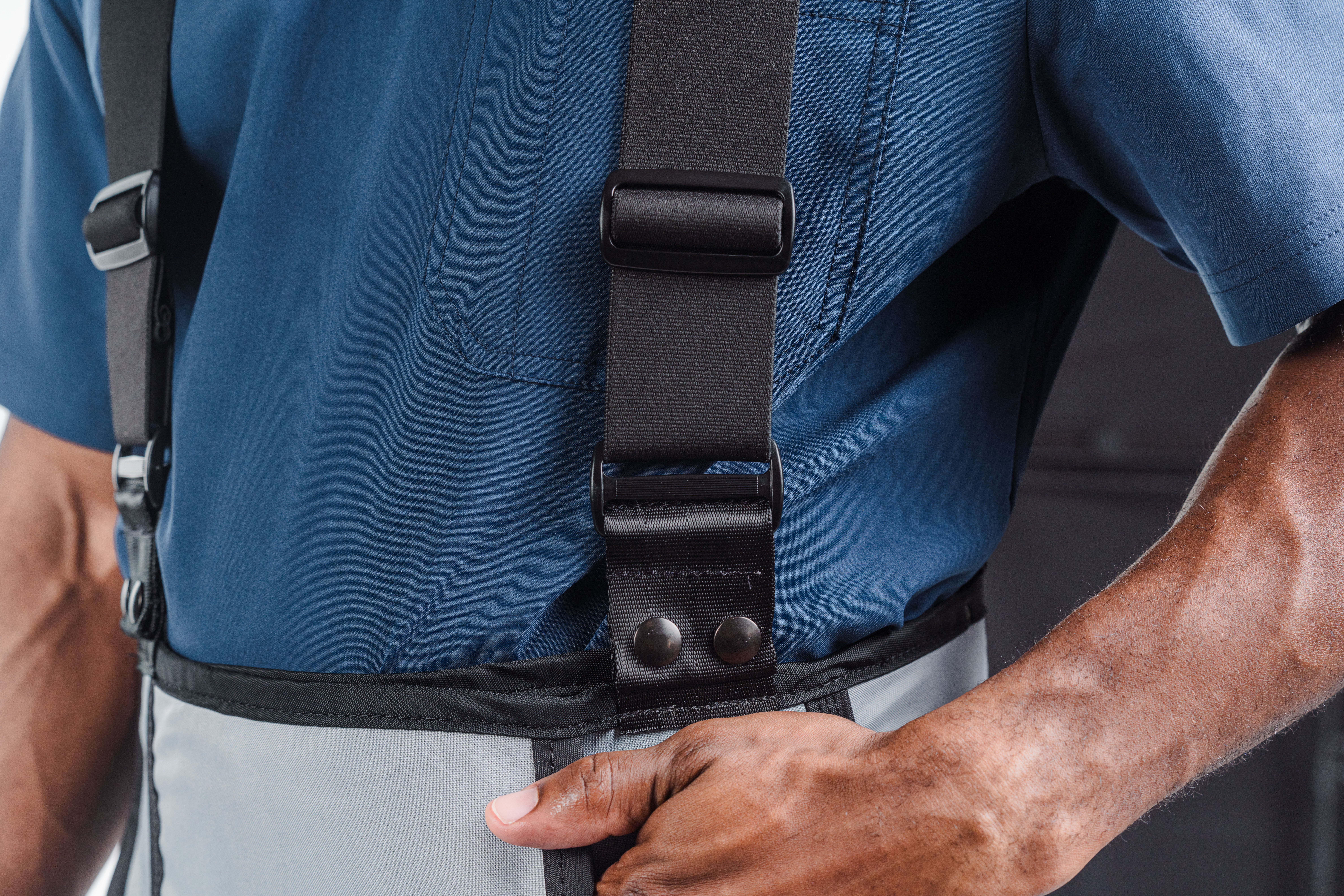 Braces are an excellent lead apron option for those who have equal hip and waist measurements so that the kilt is secure. Braces, also known as suspenders, can be combined with the Elastic Waist or Non-Skid Material. We recommend that all braces be installed with snaps for easy replacement.